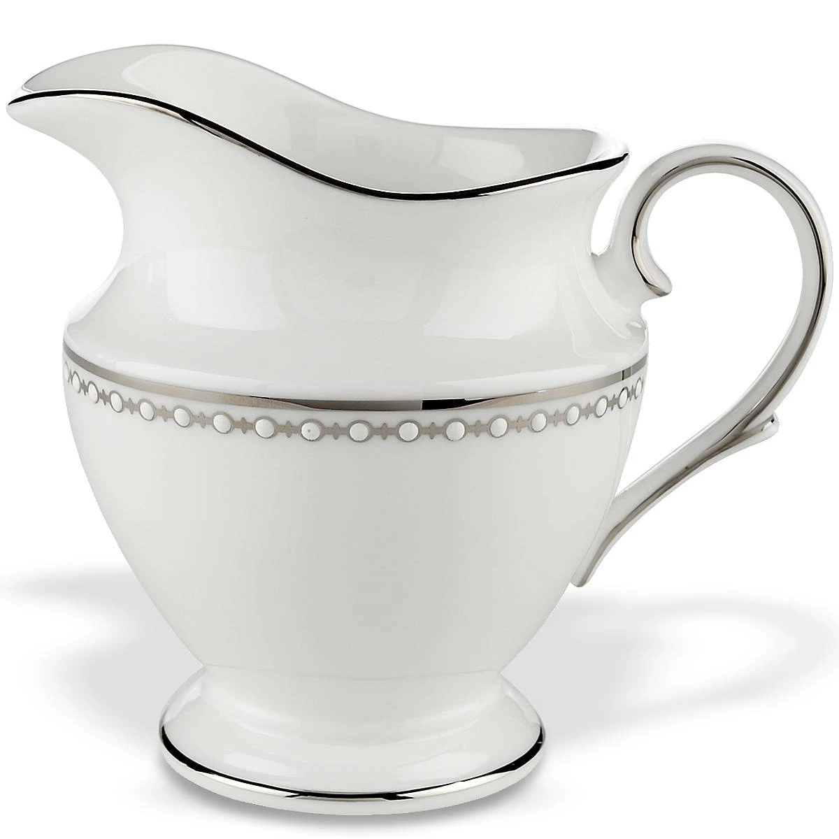 Ideal for use during a tea time or dessert course, the bold and extravagant Pearl Platinum Creamer features a modern design of pearlescent, hand-applied enamel dots on a traditional, pristine white surface. This durable bone china creamer is thoroughly accented in precious platinum, and is dishwasher-safe for added convenience.