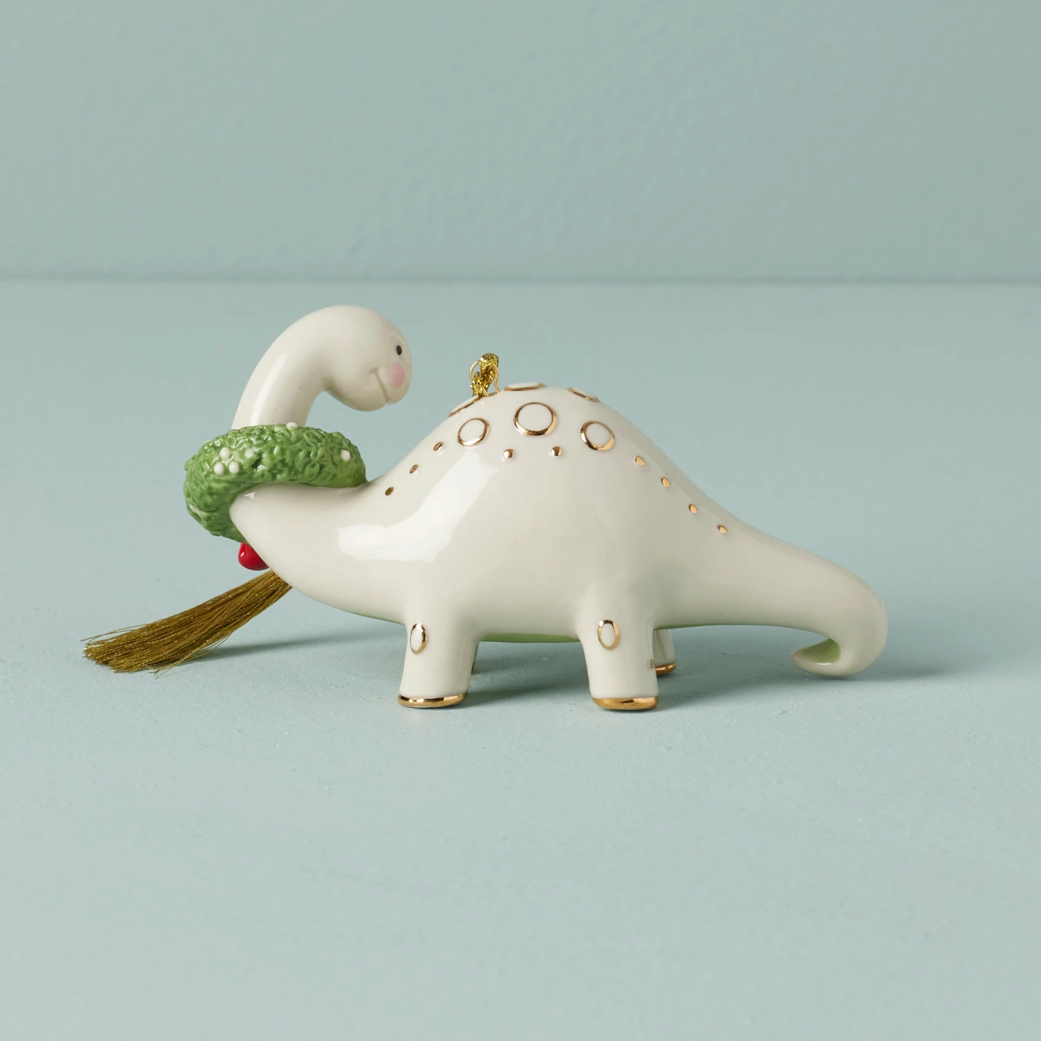 This Brachiosaurus dinosaur ornament is complete with a sweet smile, blushing cheeks and a wreath around its long neck. Crafted of creamy ivory porcelain and 24k gold spots along its back, this dinosaur ornament is the perfect gift for the special child in your life—and it’s available for personalization!