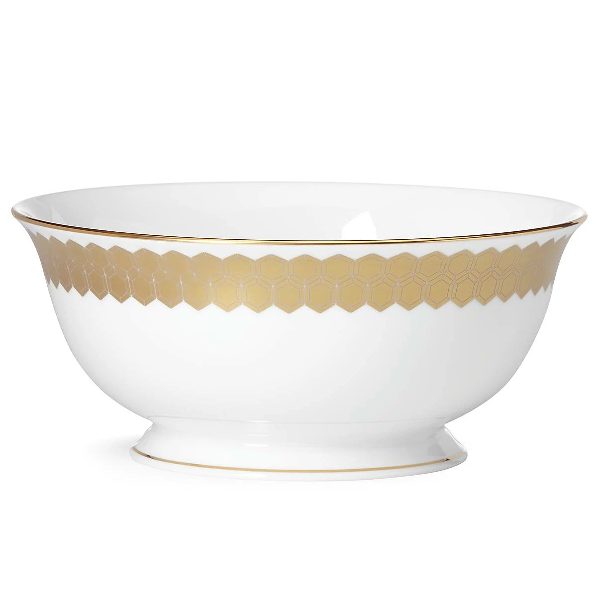 The elegant and sophisticated Prismatic Gold Large Serving Bowl features a pristine white surface that is framed by a golden hexagonal motif, and is ideal for serving large salad and pasta courses. This durable bone china serving bowl is accented in regal 24-karat gold, and is dishwasher-safe for added convenience.