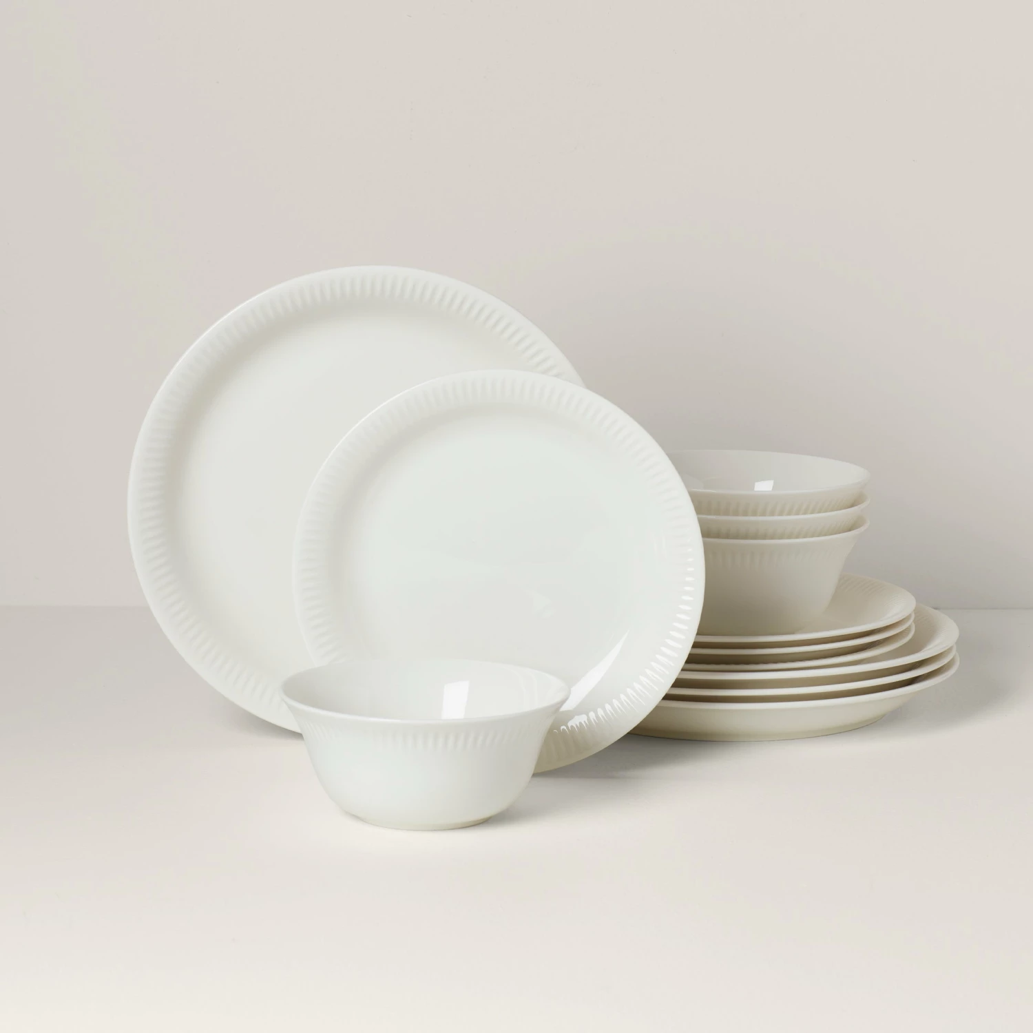 This 12-piece porcelain dinnerware set comes from our Profile collection, which takes the standard white dinnerware that every home needs and updates it with our signature Lenox artistry. Get creative by mixing and matching with other fresh colors and patterns to make your table uniquely yours. This set includes four dinner plates, four accent plates and four all-purpose bowls.