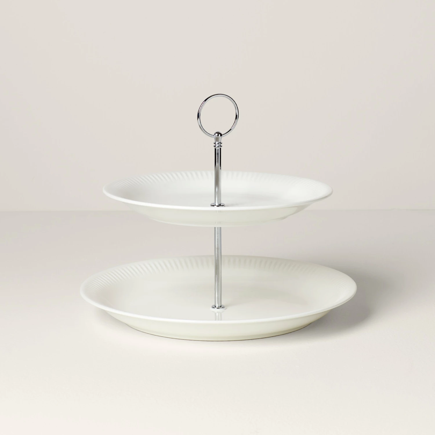 Set out appetizers, desserts and other delicious treats on this two-tiered server from our Profile collection. Crafted of pristine white porcelain, it’s designed to be the classic serveware starter set every home or apartment needs for hosting!