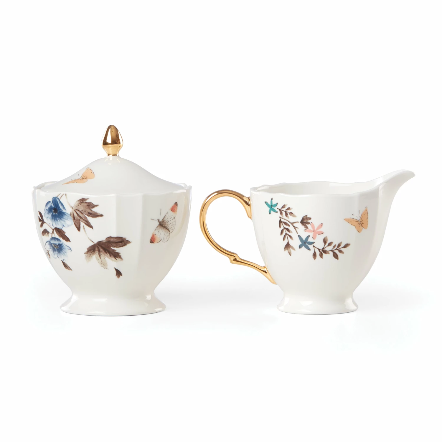 Bring the beauty and bright colors of a lush English garden to your home with the Sprig & Vine collection. This sugar bowl and creamer set features botanical illustrations inspired by vintage textiles. The golden handle on the creamer is the perfect touch to give this set a gleaming finish.