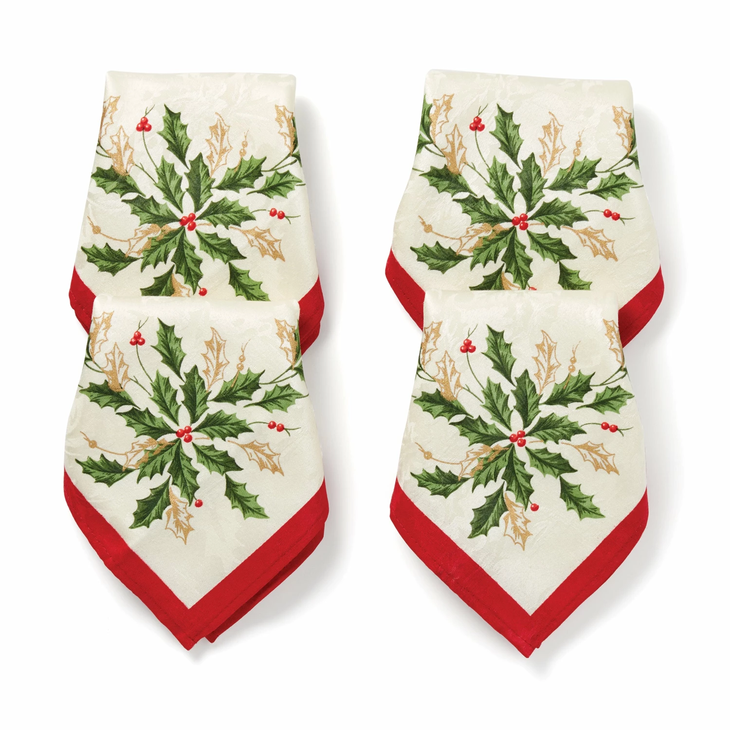 Our legendary Holiday pattern from the 1970s comes to your table in a new way through this 4-piece cloth napkin set that coordinates with your favorite dinnerware line. The creamy white backdrop features holly leaves and berries and a bright red border along the trim. It’s a stylish addition to your Christmas table setting and a must-have for any Lenox Holiday pattern fans.