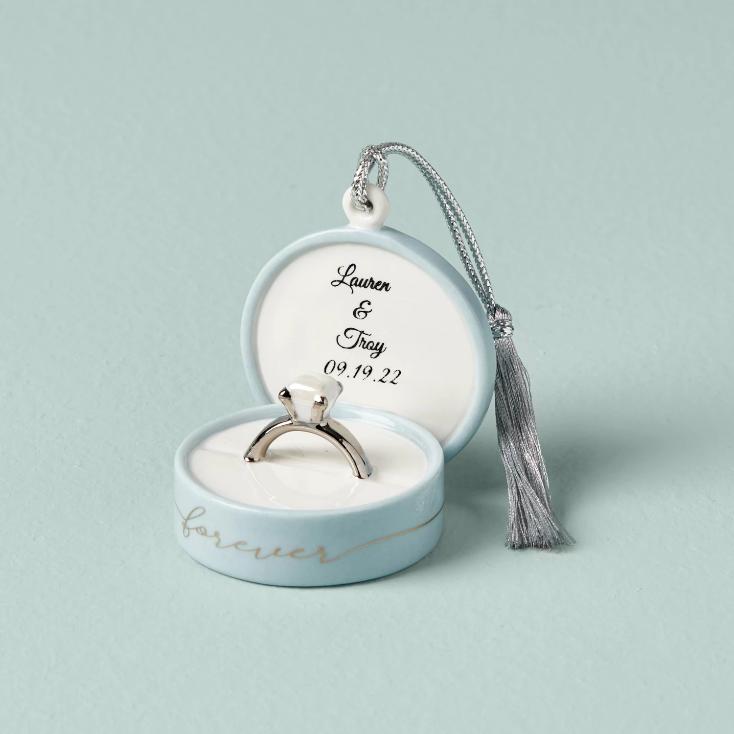After the question is popped and the champagne is poured, relive that special engagement with this beautiful ring box ornament that you can personalize with two names and a date. A simulated diamond sits at the center, while silver script text reads “forever” along the outside of the box. It’s the perfect way to remember that wonderful engagement day every time you see it on the tree.