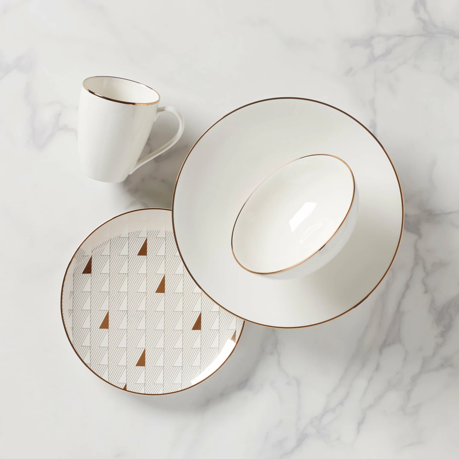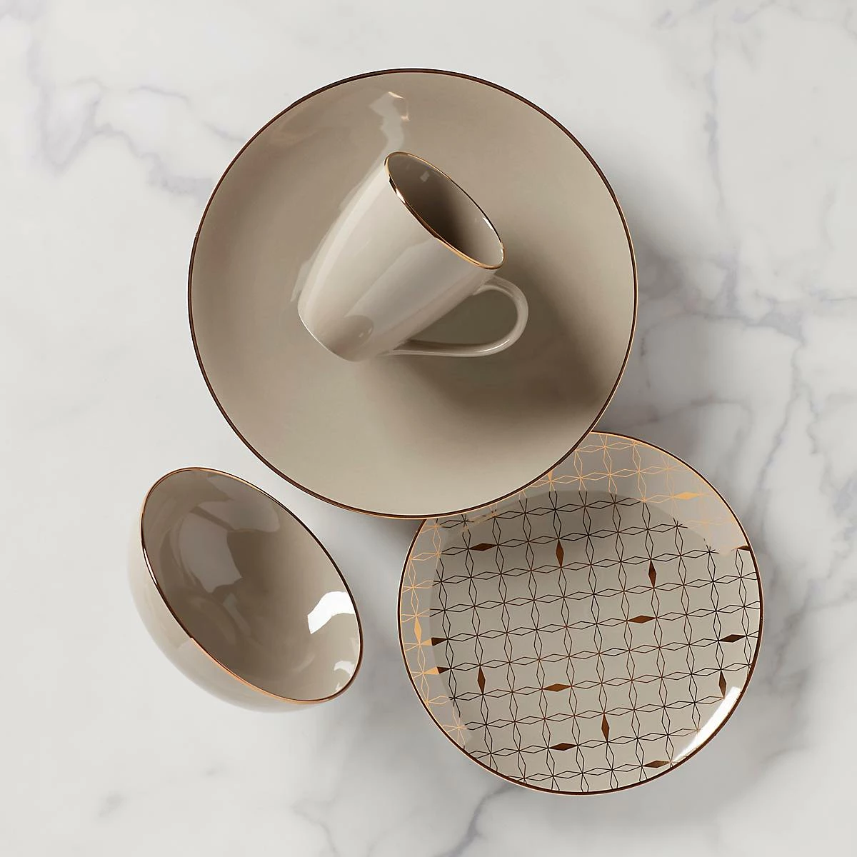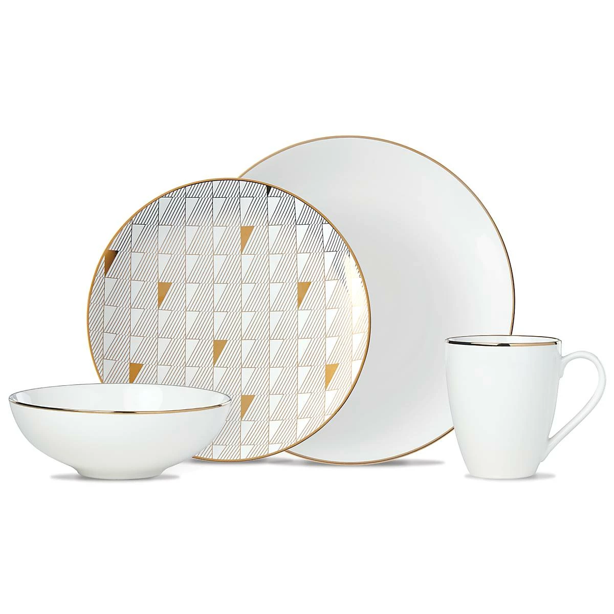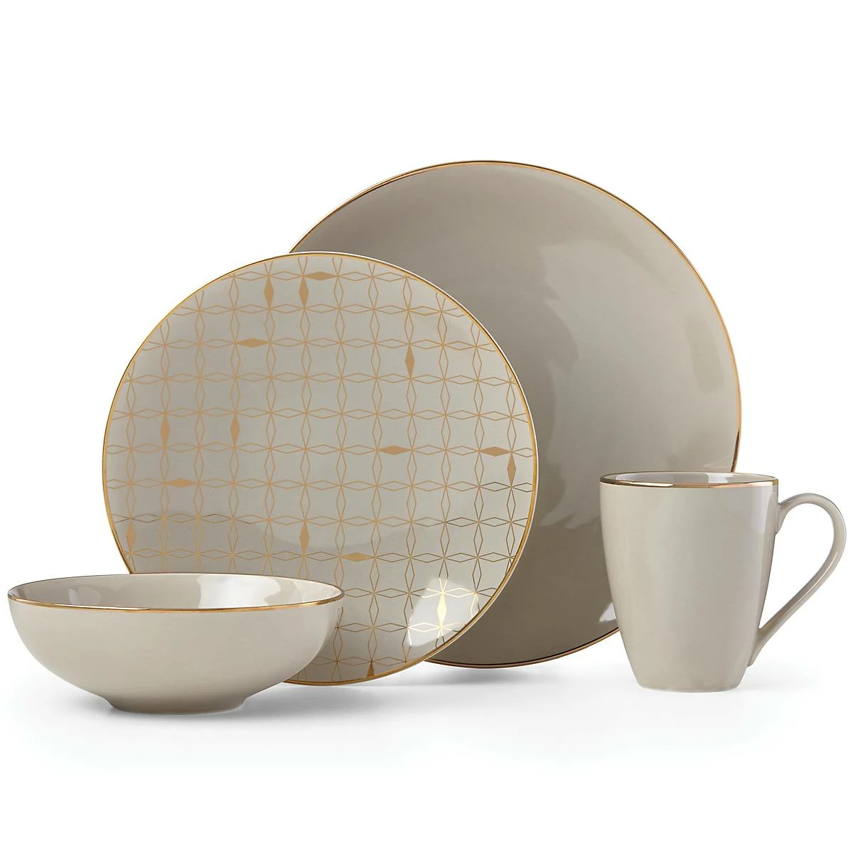 The Trianna Taupe 4-piece Place Setting boasts a rich taupe hue and striking geometric pattern with luminous gold accents. This fashion-forward set is made from dishwasher-safe, durable ceramic porcelain and microwave-safe metallics.