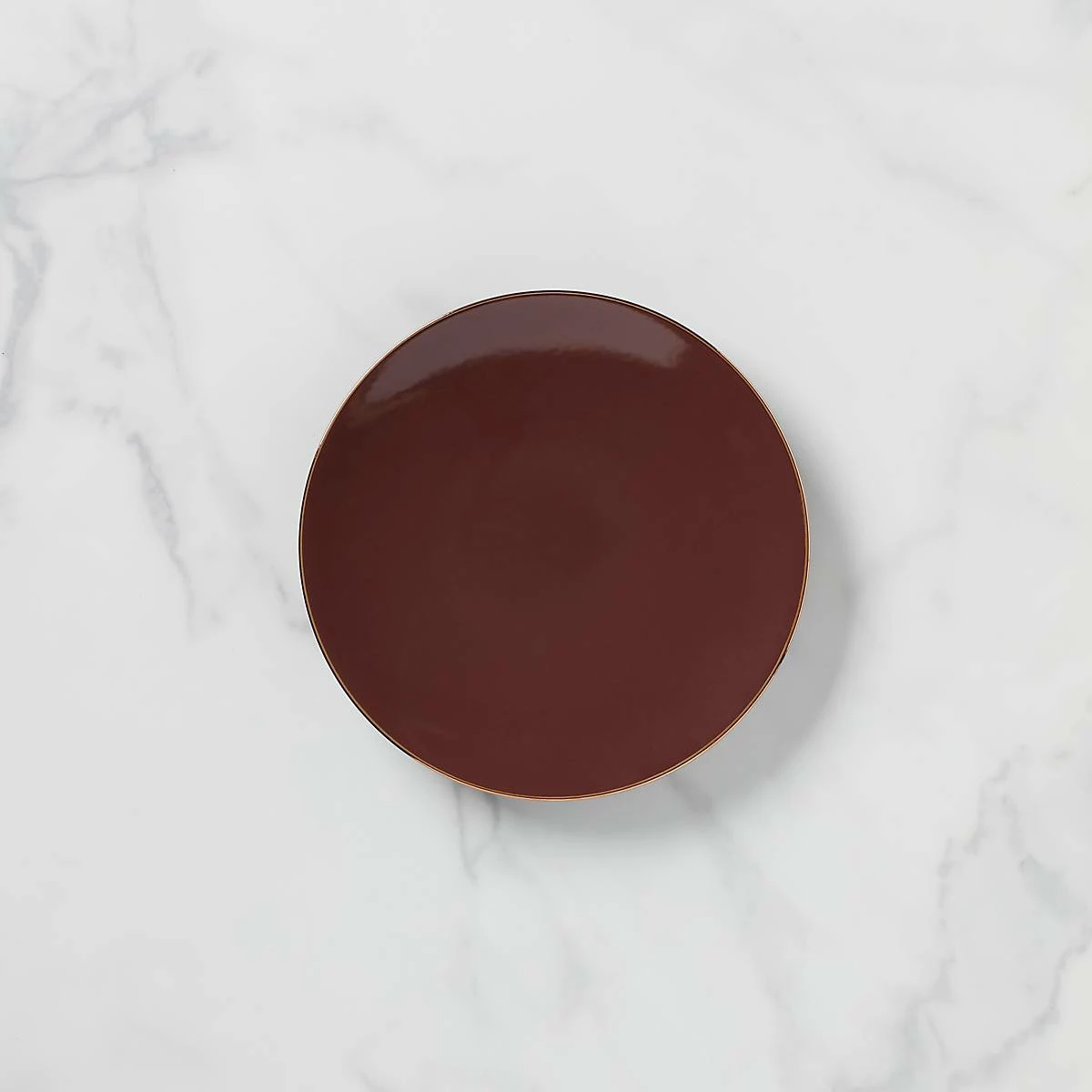 This salad plate, crafted of dishwasher-safe, durable ceramic porcelain, features a subtle geometric pattern across its coupe-shaped surface that glitters with bronze-colored accents. The border includes microwave-safe gold accents that evoke a gleaming piece of amber sea glass.