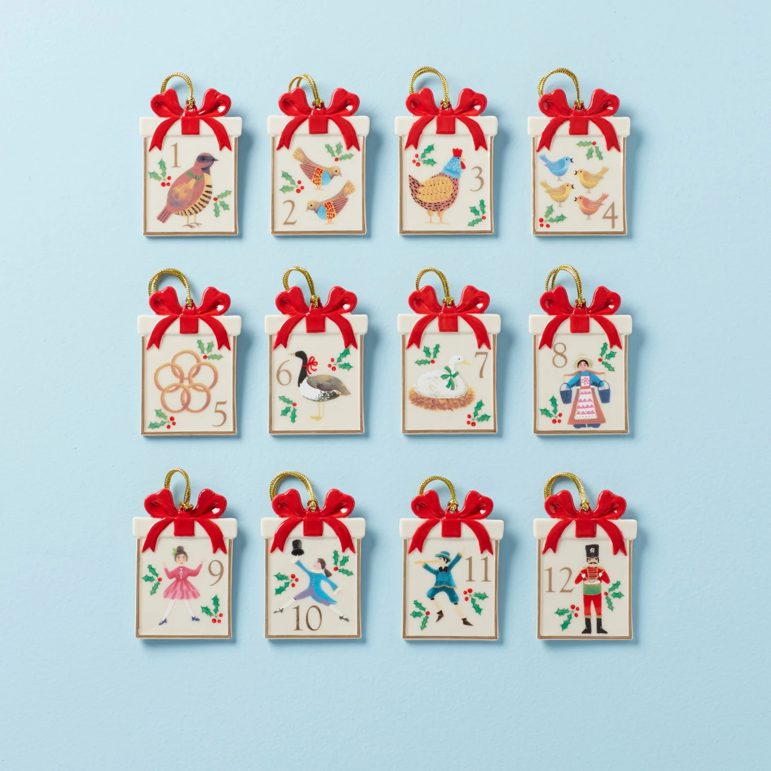 Countdown to Christmas with this delightful ornament set! Each gift box tells the story of the classic 12 Days Of Christmas song. Drummers drum, ladies dance and birds call on their own on these unique, hand-painted pieces featuring 24k gold detail. Decorate your tree with every ornament (or give it to your true love each day!)