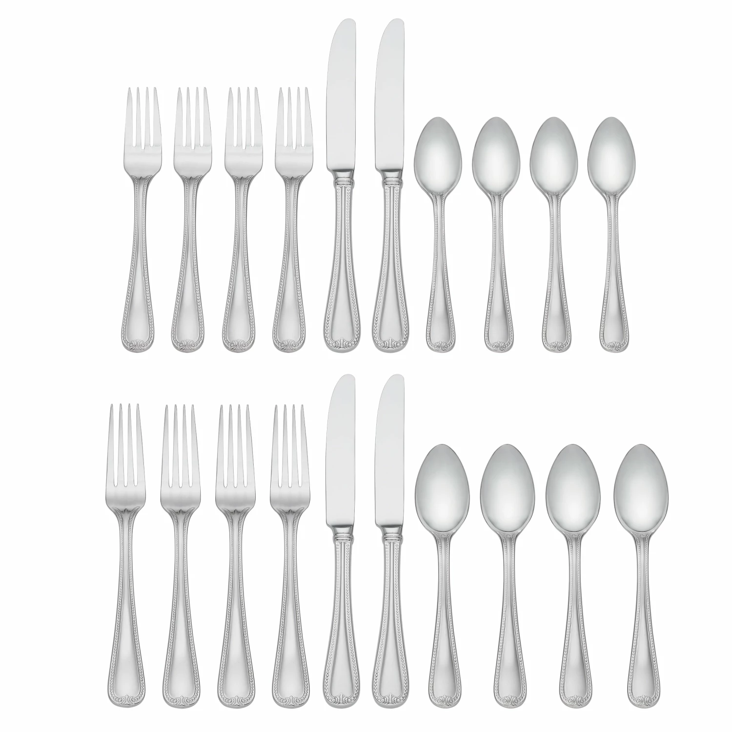 Crafted from durable, 18/10 stainless steel, the Vintage Jewel 20-piece Flatware Set is a casual and stylish flatware collection. The curved handles are finished with a beaded trim and an ornate design at the ends that match back to our iconic Vintage Jewel dinnerware. This set is dishwasher safe and includes four forks, salad forks, knives, spoons and teaspoons.