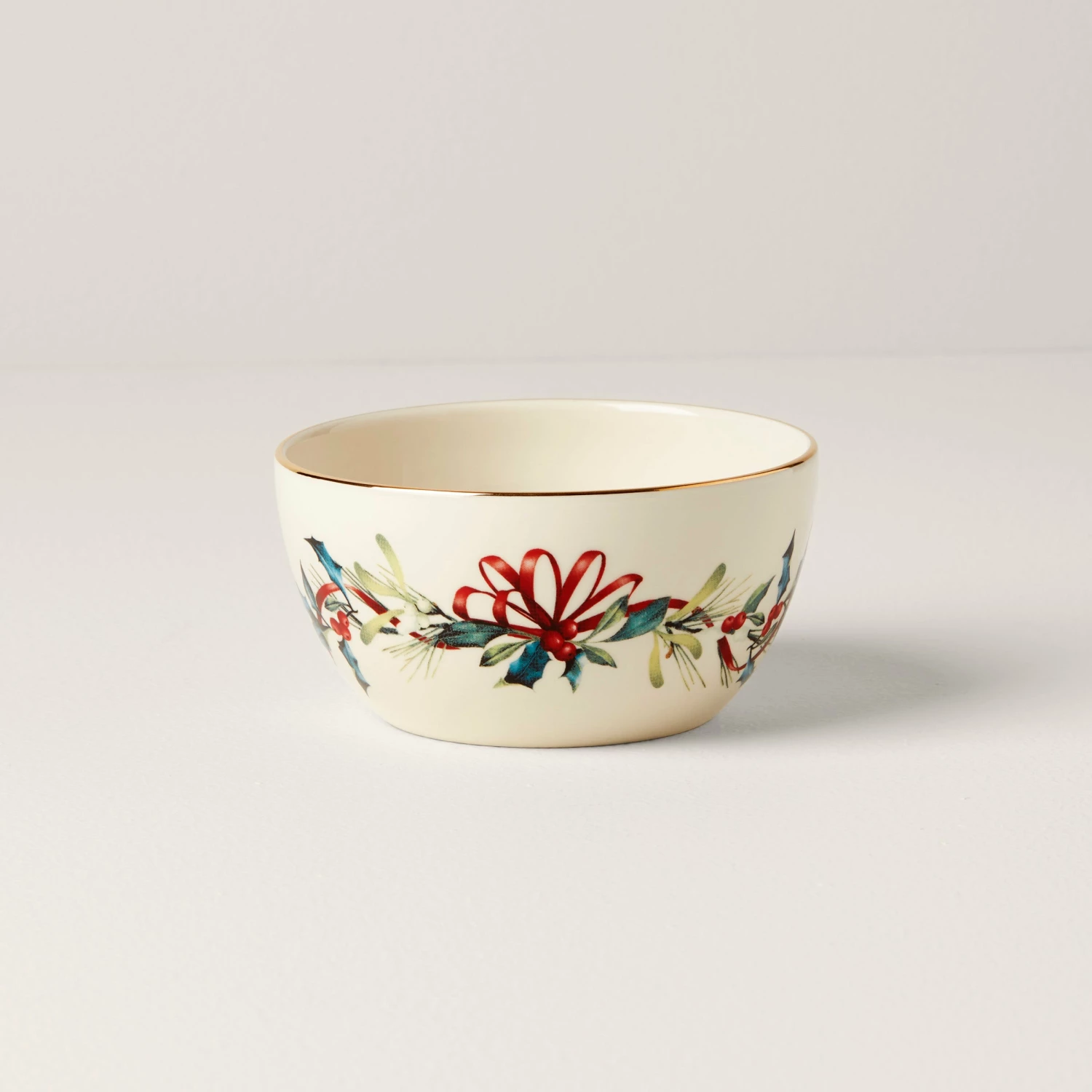 A joyful wreath of holly and ivy sprigs decorates the porcelain of this Winter Greetings Bowl. We added a 24-karat gold trim along the top so it catches the flicker of candlelight at Christmastime.