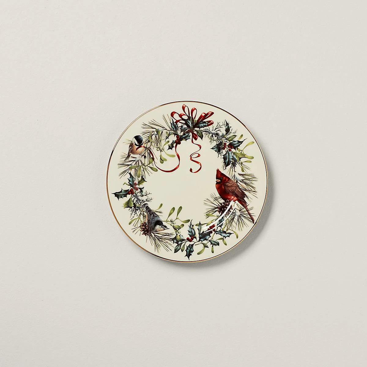 Our classic Winter Greetings Collection features peaceful birds perched amidst a motif of pinecone, holly and mistletoe. Crafted from durable porcelain with 24k gold accents, this 6-piece salad plate set makes an artful addition to the holiday tabletop.